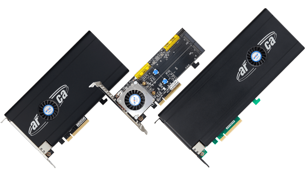 To address thermal challenges in high-performance storage, the ARC-1689-8N employs a full-length aluminum heatsink and two low-profile cooling fans, keeping M.2 NVMe SSDs within optimal temperature ranges. The ARC-1689-8N is compatible with in-box (native) OS NVMe host drivers. It is backward-compatible with PCIe 3.0/4.0 and supports x1 to x16 signal modes. Stable power is delivered via a dedicated 6-pin PCI-E power connector.