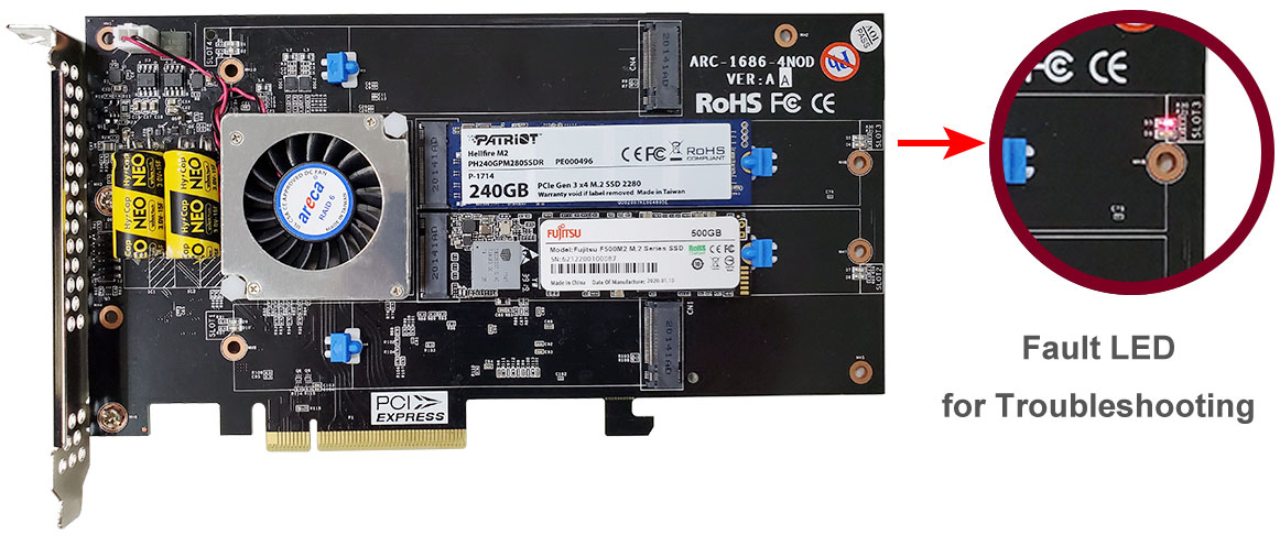 On-board Supercapacitor module keeps M.2 fault LEDs status to easy identify failed drive when ARC-1686-xNOD RAID adapter removes from system PCI-e slot.