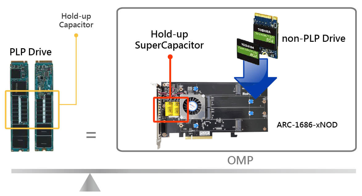 An enterprise storages need to ensure data integrity in the event of power lose and system crash. The Power Lose Protection (PLP) is hardware and firmware solution on the ARC-1686-xNOD to ensure that NVMe SSD integrity is maintained when a power loss event occurs.
