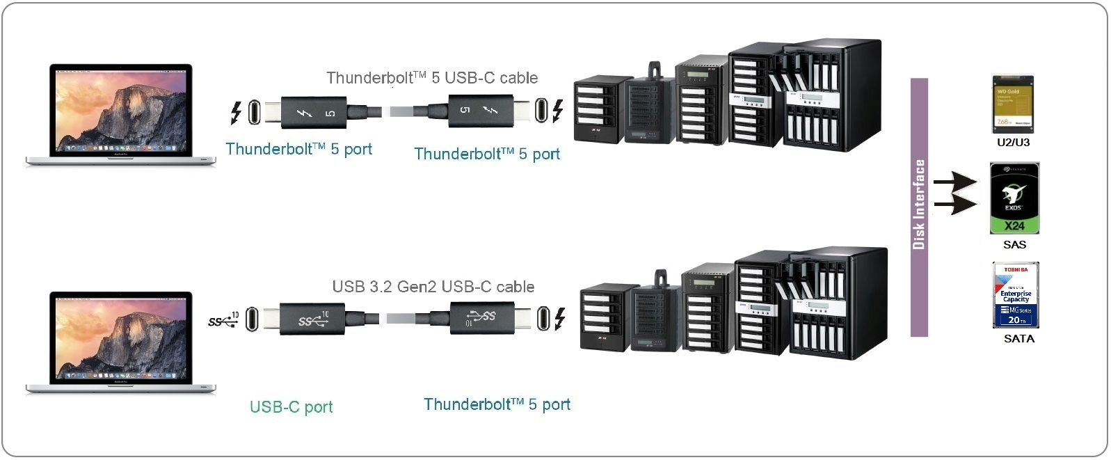 Areca Technology Corporation (ARECA), a leading provider of internal, external and Thunderbolt RAID storage, today announced the shipping of the Thunderbolt 5 RAID storage:ARC-8050T5U Thunderbolt 5 offers both Thunderbolt and USB on the same TB5 connector for increasing connectivity on the USB based hosts. In short: ARC-8050T5U is based on Thunderbolt 5 technology, backwards compatible with USB 3.2 Gen2 interface. Areca Technology is the only supplier of PCIe Gen4 tri-mode RAID adapter (ARC-1886 series) that supports macOS operating system. This product has been sold for several years and has been widely praised for its stability, performance and hardware RAID. Thunderbolt 5 pushes its speed to 80Gbps, and ROC that can provide PCIe gen4 interface must be able to meet its speed requirements. Therefore, Areca Technology can easily use ARC-1886 product as the core architecture to launch a fast, stable Thunderbolt 5 RAID storage product that supports three kind of device interfaces Gen4 NVMe (U.2/U.3)/SAS/SATA at the same time. This product also supports two types of encryption: board-level and device-level. Board-level encryption uses the controller ROC internal encryption engine to allow the use of non-encrypted device as if they were encrypted devices without impacting the performance. In addition, Areca has added an additional USB 3.2 Gen2 device interface component, which allows the ARC-8050T5U RAID storage to be connected to the USB 3.2 type C interface using same TB5 connector, and with the speed of USB 3.2 Gen2, it can be used on computers that only have USB host interfaces.